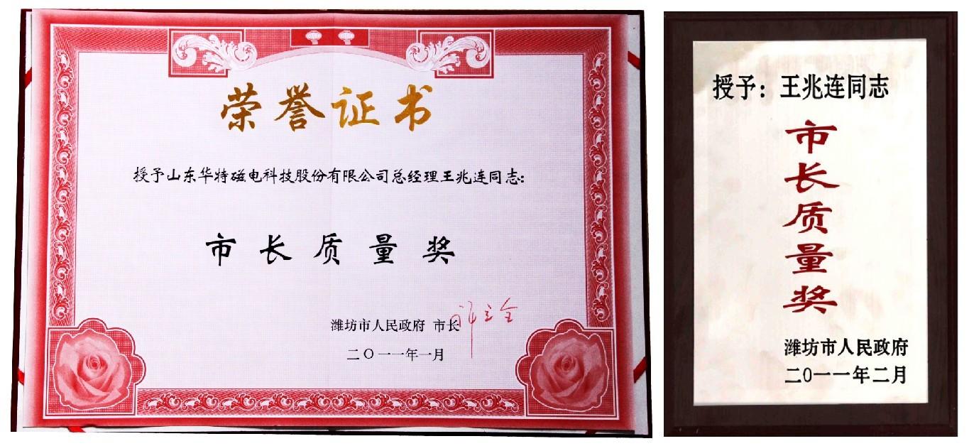 2月25日,在濰坊召開的市長質量度獎頒獎大會上,公司董事長兼總經理榮獲“2010年度濰坊市市長質量獎”。這是濰坊市最高質量獎項。王兆連董事長帶領企業積極推行卓越績效評價準則等先進質量管理方法,倡導創建有特色的企業質量文化,強化技術創新體系建設,推動降低消耗、利用資源、保護環境,實現了質量效益和可持續發展。