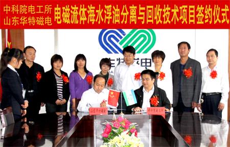 山東半島藍色經濟區建設已正式上升為國家戰略,成為國家海洋發展戰略和區域協調發展戰略的重要組成部分。為保護海洋生態,解決海水油污染治理難題,為山東“藍區”建設提供技術支撐,2011年9月28日,公司與中科院電工所“電磁流體海水浮油分離與回收技術”技術開發合同簽字儀式在公司總部舉行。公司董事長兼總經理王兆連與電工所成果轉化處處長丁明仁分別代表雙方在合同上簽字。