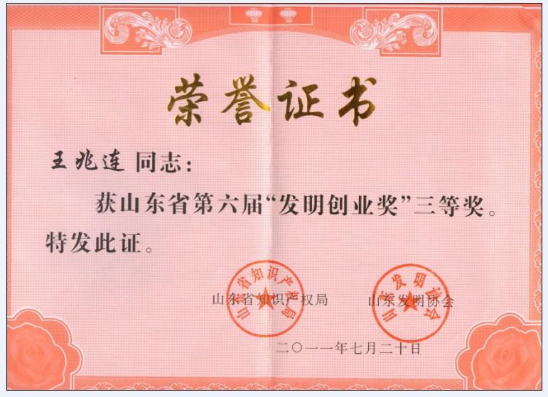 日前,由省知識產權局、山東發(fā)明協(xié)會組織評選的山東省第六屆“發(fā)明創(chuàng)業(yè)獎”評選揭曉,公司董事長兼總經理王兆連獲三等獎。