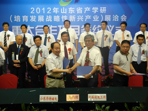 6月1日,山東省產(chǎn)學(xué)研(培育發(fā)展戰(zhàn)略性新興產(chǎn)業(yè))展洽會在濟南召開。在其重大合作項目簽約儀式上,公司與中科院電工所簽訂了“蒸發(fā)冷卻立環(huán)高梯度磁選機的研制”技術(shù)開發(fā)合同。公司董事長兼總經(jīng)理王兆連與電工所顧國彪院士分別代表雙方在合同上簽字。這也是繼2004年雙方聯(lián)合研制蒸發(fā)冷卻電磁除鐵器后的又一次合作,主要是利用蒸發(fā)冷卻介質(zhì)的良好導(dǎo)熱性解決立環(huán)磁選機勵磁線圈的溫升問題,提高磁感強度。該項目研發(fā)成功后,其背景場強可達1.5特斯拉,主要解決目前常規(guī)立環(huán)不能解決的難選礦的選鐵和高純石英、鉀鈉長石等非金屬礦加工的鐵雜質(zhì)提純等難題。省委副書記、副省長王軍民和濰坊市副市長潘強等省市領(lǐng)導(dǎo)參加了簽約儀式。