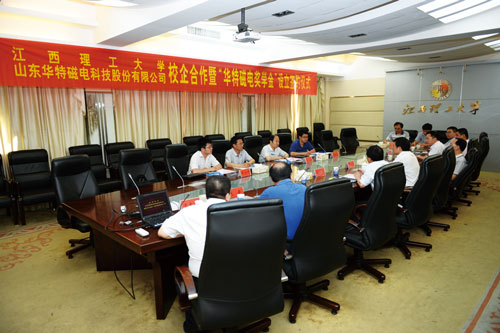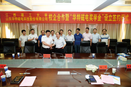 6月30日上午,公司董事長兼總裁、磁電聯盟理事長王兆連、技術總工程師賈洪利等一行4人到江西理工大學洽談校企合作事宜,并簽訂校企戰略合作協議和捐資華特磁電獎學基金協議。江西理工大學校長羅嗣海、副校長溫和瑞、楊斌以及黨辦校辦、研究生院、學工部、對外聯絡與合作處、科技處、資環學院相關負責人出席了簽約儀式。簽約儀式由溫和瑞副校長主持。