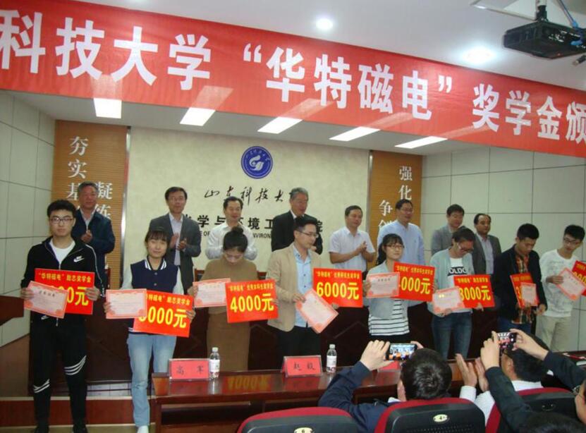 根據(jù)公司與山東科技大學(xué)簽訂的“華特磁電”獎學(xué)金使用辦法,本次獎學(xué)金發(fā)放給化學(xué)與環(huán)境工程學(xué)院的在校學(xué)生。這是公司在山東科技大學(xué)頒發(fā)的第二屆“華特磁電”獎學(xué)金。山東科技大學(xué)黨委副書記李道剛,學(xué)生工作部、校團委、教務(wù)處、合作發(fā)展處、化工學(xué)院負(fù)責(zé)人出席會議,會議由化工學(xué)院黨委副書記竇存增主持。獲獎學(xué)生以及礦物加工工程系教師、研究生、本科生代表參加會議。