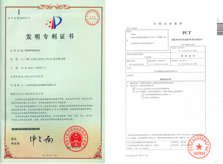 “提精降渣磁選機”是華特公司自主研發的專利產品,擁有國內發明專利授權1件、PCT專利授權1件, 2014年列入山東省科技發展計劃,2015年通過新產品鑒定。