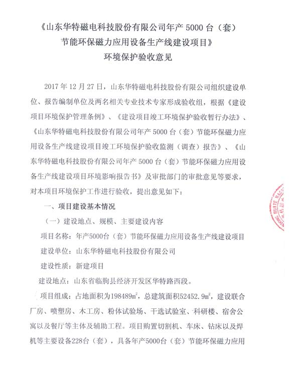 根據《建設項目竣工環境保護驗收暫行辦法》的有關規定,我公司于2017年12月27日組織年產5000臺(套)節能環保磁力應用設備生產線建設項目環保驗收。現將驗收意見予以公示,公示期為2017年12月29日-2018年1月28日。