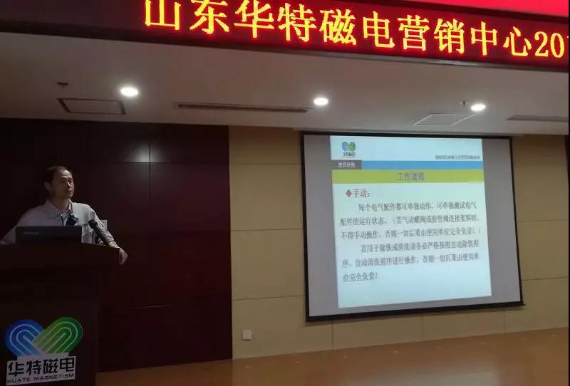 總結會后,營銷中心組織全體銷售人員和售后服務人員開展公司高新技術產品培訓活動,邀請技術中心工程師詳細介紹了非金屬礦生產線、漿料磁選機、高壓輥磨機、立環高梯度磁選機、風力分選磁選機及提精降渣磁選機、電磁淘洗精選機等產品的技術工藝。