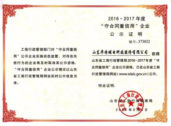 根據(jù)《山東省守合同重信用企業(yè)公示辦法》,山東省工商局決定,向社會公示2016~2017年度“守合同重信用”企業(yè)共5487戶,山東華特磁電科技股份有限公司榜上有名。本次被認定為“山東省守合同重信用企業(yè)”是對公司近兩年在合同信用管理、合同履約、經(jīng)濟效益、社會責任和信用信譽等工作的重大肯定,是公司誠信履約、守法經(jīng)營的重大體現(xiàn),進一步增強了公司的知名度,提高了公司的軟實力。