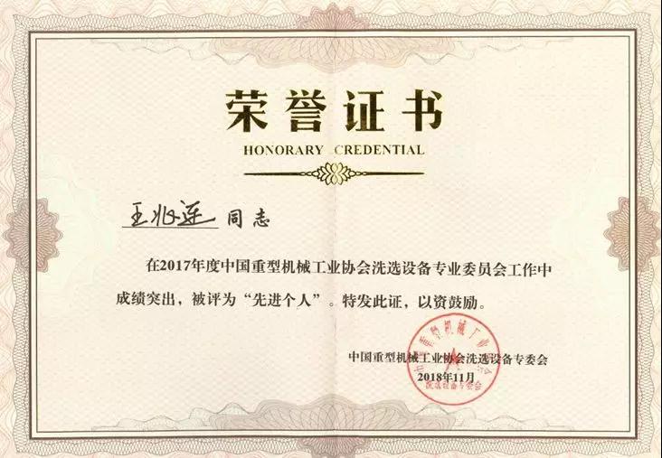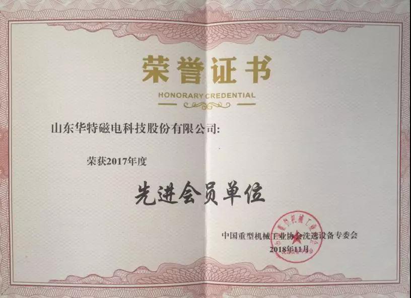 中國重型機(jī)械工業(yè)協(xié)會(huì)洗選設(shè)備專業(yè)委員會(huì)副理事長、鎮(zhèn)江電磁設(shè)備廠有限責(zé)任公司董事長楊鋼宣讀了2017年度優(yōu)秀單位及優(yōu)秀協(xié)會(huì)工作者的表彰決定,山東華特磁電科技股份有限公司被評(píng)為“2017年度先進(jìn)會(huì)員單位”,董事長王兆連被評(píng)為“先進(jìn)個(gè)人”。