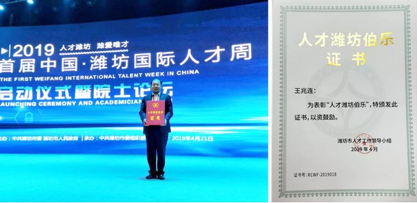活動期間,惠新安書記和省委組織部劉樹軍副部長為獲獎企業(yè)家頒發(fā)了首屆中國?濰坊國際人才創(chuàng)業(yè)大賽和人才伯樂獎。王兆連董事長喜獲“人才濰坊伯樂”獎。