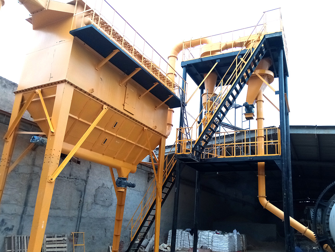 整套分級裝置由氣流分級機(jī)、旋風(fēng)收集器、脈沖除塵器、高壓引風(fēng)機(jī)、電控柜等組成。氣流分級機(jī)是帶有二次進(jìn)風(fēng)及立式安裝的大葉輪轉(zhuǎn)子的強(qiáng)制型分級機(jī)。工作時物料在引風(fēng)機(jī)引力的作用下由下筒身進(jìn)入,外界一次風(fēng)與物料充分混合,使粒子得以充分分散,并上升至分級區(qū),由于分級葉輪轉(zhuǎn)子的高速旋轉(zhuǎn),粒子即受到分級葉輪旋轉(zhuǎn)產(chǎn)生的離心力,又受到引風(fēng)機(jī)引力產(chǎn)生的向心力,當(dāng)粒子受到的離心力大于向心力,分級徑以上的粗粒子被甩到筒體內(nèi)壁失速沿壁面下滑,外界二次風(fēng)通過均勻分布在錐體上的進(jìn)風(fēng)口進(jìn)入,對粗粒子進(jìn)行產(chǎn)生風(fēng)篩作用將混雜或粘附于粗料中的細(xì)粉分離干凈,分離后的粗料由卸料裝置收集排出分級機(jī),分級徑以下的細(xì)粉隨氣固二相流進(jìn)入旋風(fēng)收集器、脈沖除塵器收集下來,凈化后的氣體由引風(fēng)機(jī)排出。